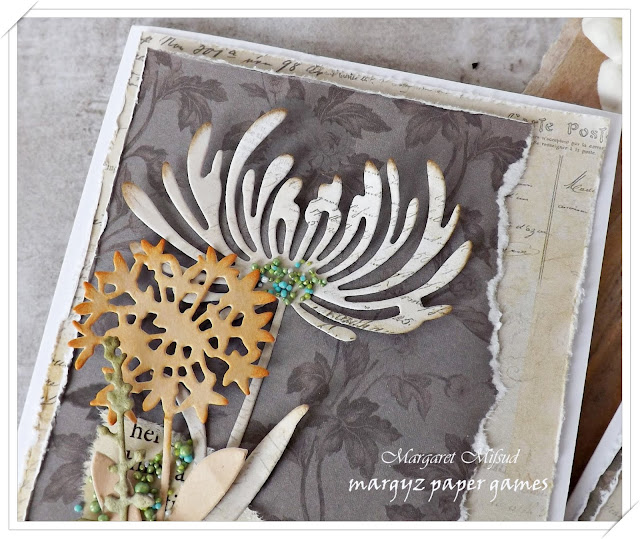 I have used pieces of book paper on both cards as well as a torn piece of corrugated board. On this first card I have added some gesso to the corrugated board .. adds an extra bit of texture.