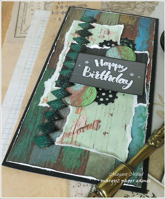 The papers I collected for these cards is, as is usually the case, by Kaisercraft. I also die cut lots of cogs (because I like those on my male cards) and printed out a few clocks (another embellie I love to use, not just on my male cards, but on the more feminine ones as well) and gathered some chippies and some fibre pieces as well. So, to make each card, that was the stash I had to select from. I should have taken a photo of it all but, unfortunately, didn't think of that at the time. Duh!!
