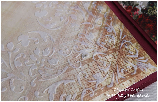 I have not decorated the inside pages very much at all. I feel that the papers themselves are the decoration but, on a couple of them I have done a little stenciling as you can see here. Using translucent stenciling paste still allows the patterns to shine through.