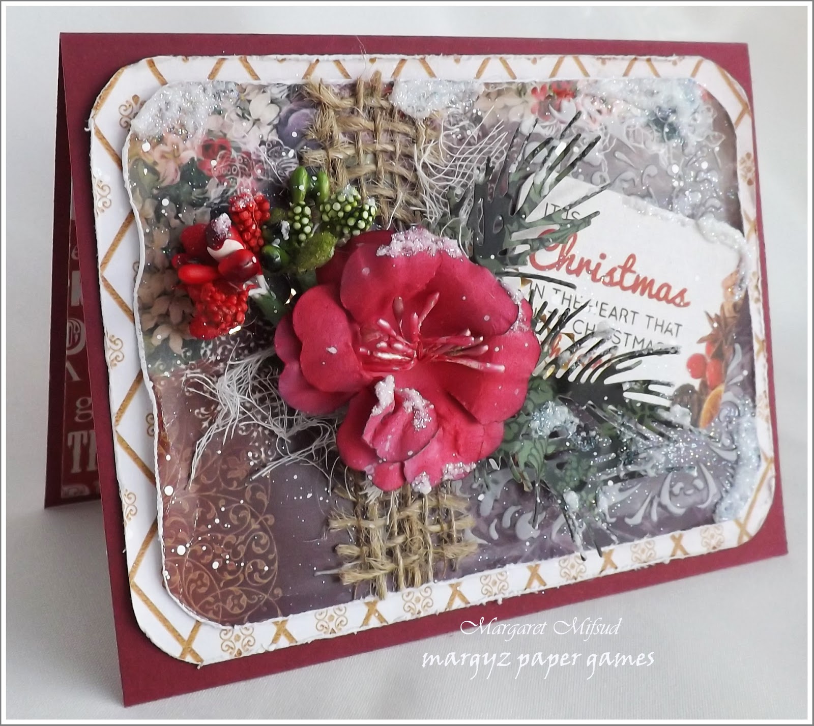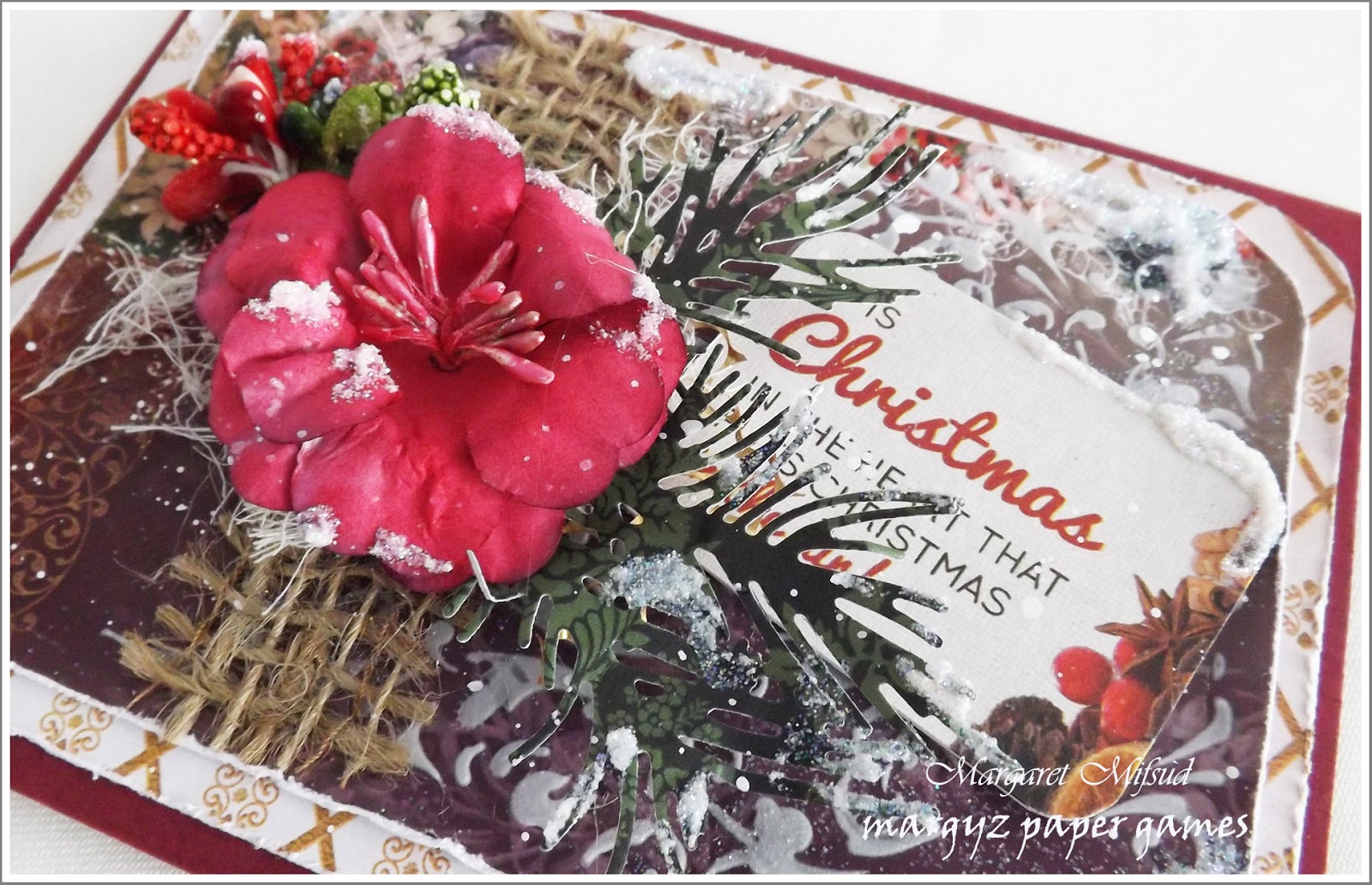 A bit of hessian ribbon added to this one and, once again, I have torn the center out of the top DP layer. Also, I have been using some Quick Release Die Paper from Couture Creations while cutting my pine branches (it really works to release the paper from the die so much easier) and, on this card I decided to add it to my branches under the flowers.