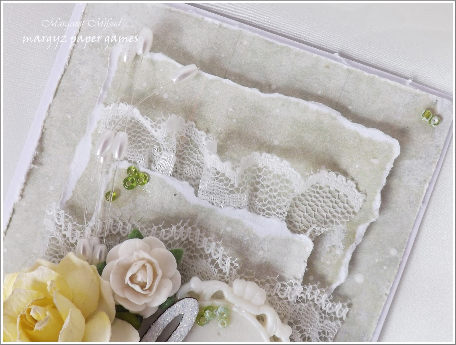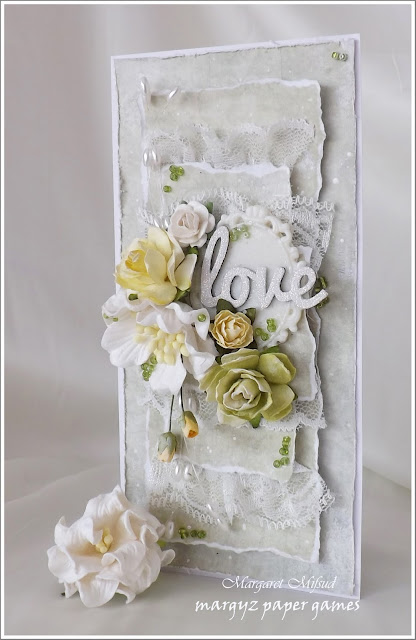 This exquisite card is sure to brighten anyones day. It is so beautiful and soft. I love the layers of lace between the card. Truly gorgeous. Such a good idea to buy white flowers and colour them yourself. I have hundreds of flowers but can never find the right colours.