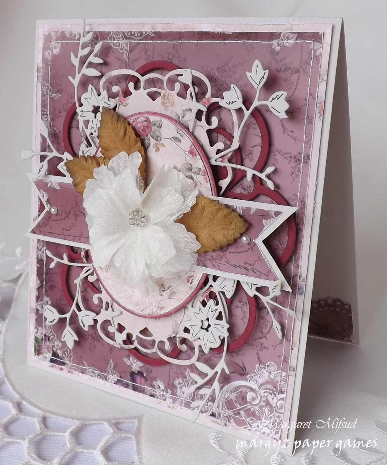 The die cuts are Couture Creations 'Starburst Doily Die', and 'Oval Nesting Dies' and Marianne Creatables 'Frame & Swirls'.  The banner was cut from the cardstock by hand and layered with the same paper.  The floral sprigs were cut with the 'Honey Blossom Sprig Die' from Memory Box.
