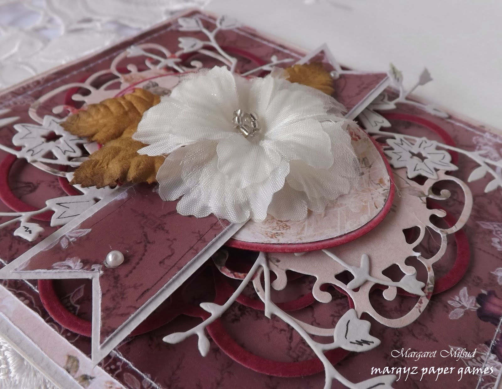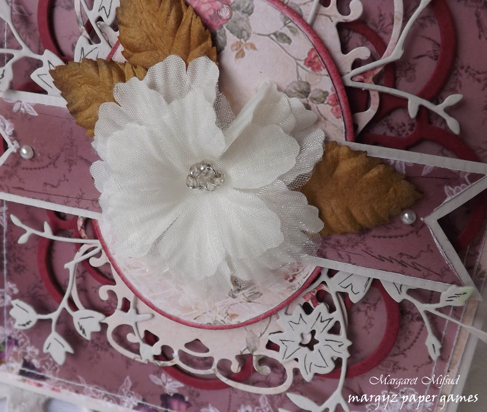 The large flower is called Meadow and both it and the small roses are available at Meg's Garden.com.  The leaves were cut using my Silhouette (they are actually left overs from my Christmas cards) and I used some Perfect Pearls for the veins.  The small branches were cut with Martha Stewart's Twig Branch Punch and the music is Memory Box's Virtuoso Music Die.