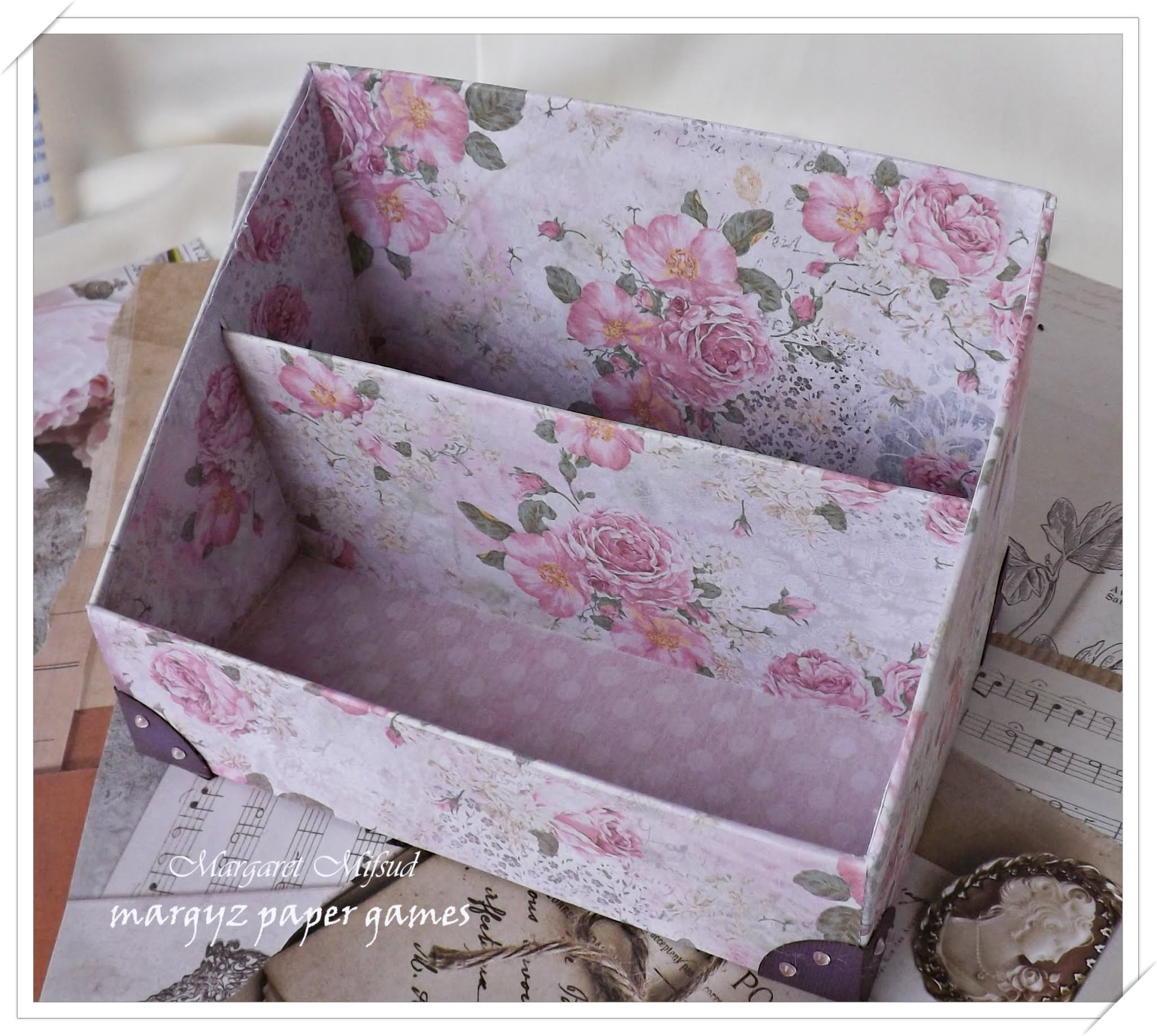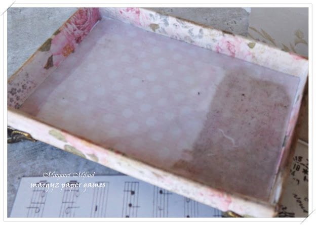 This was a tray I already had made up. I simply covered and lined it with new papers and edged it with cardstock. The papers are from Kaisercraft's Misty Mountains Collection.