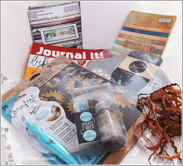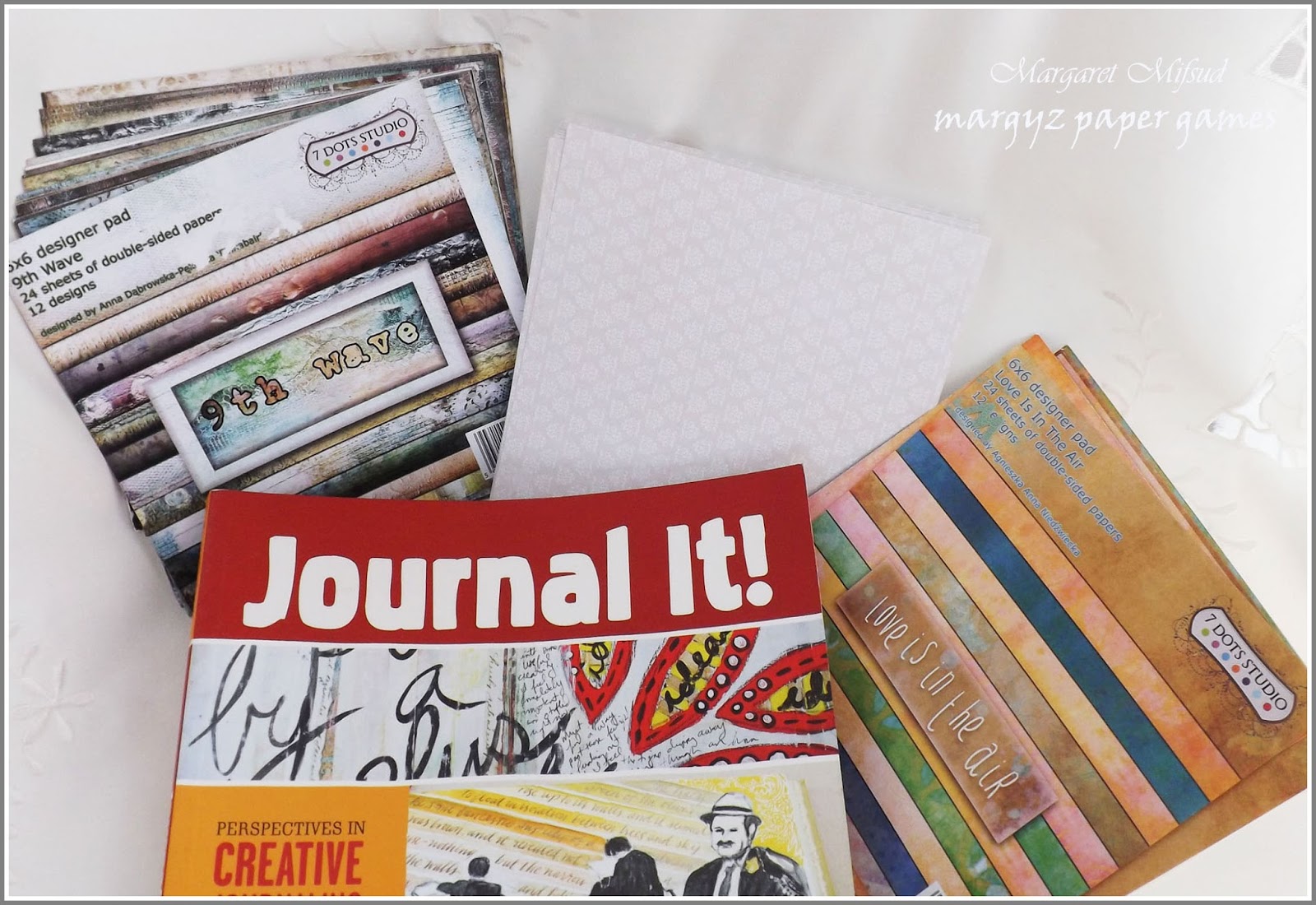 There's 2 pads of 7Dots Studio papers (have always wanted some of those). Another pad from a different Manufacturer (who I can't name because I'm afraid I threw out the packaging and it's gone into the re-cycle bin) and a Journaling Magazine.