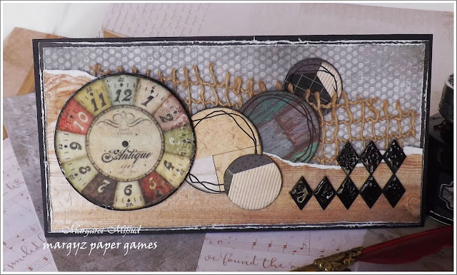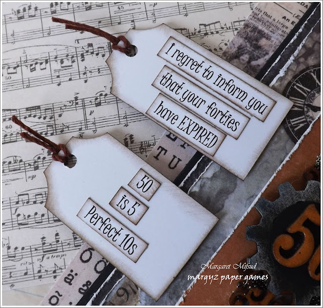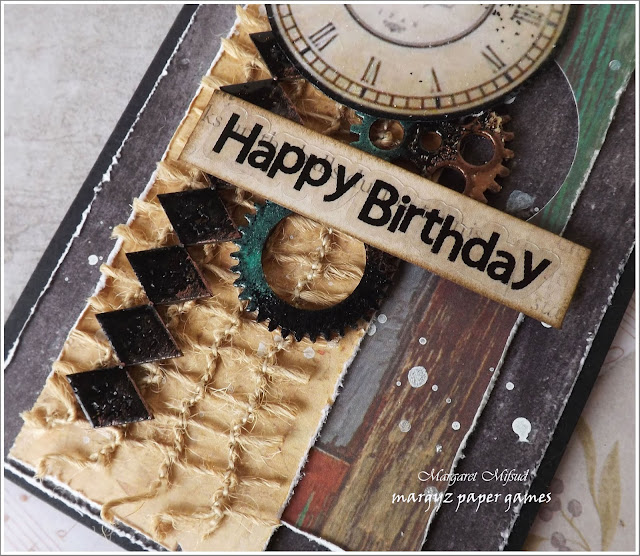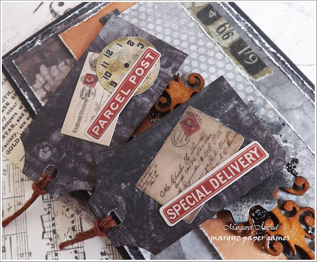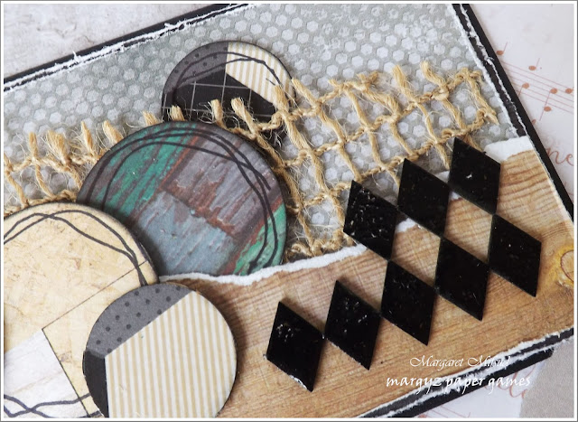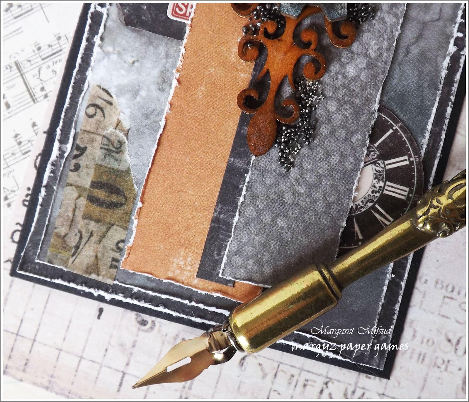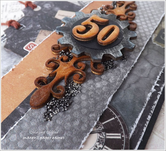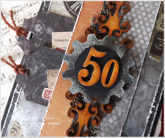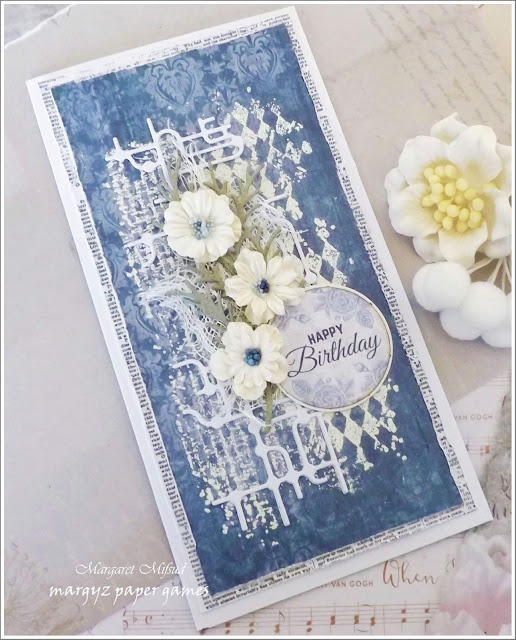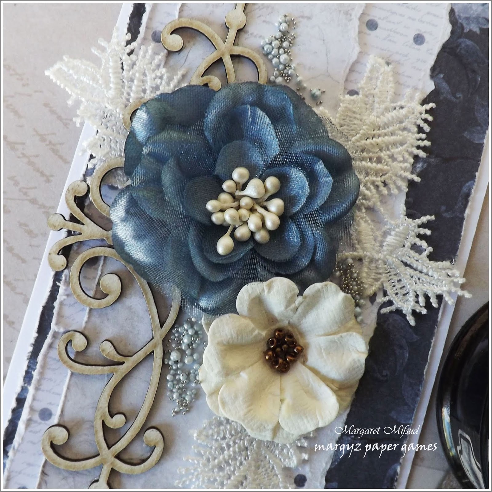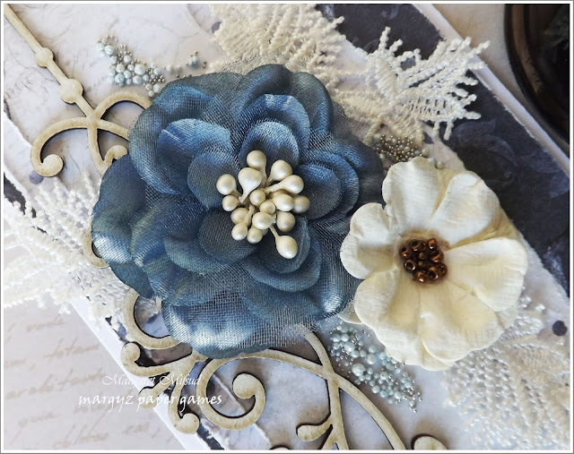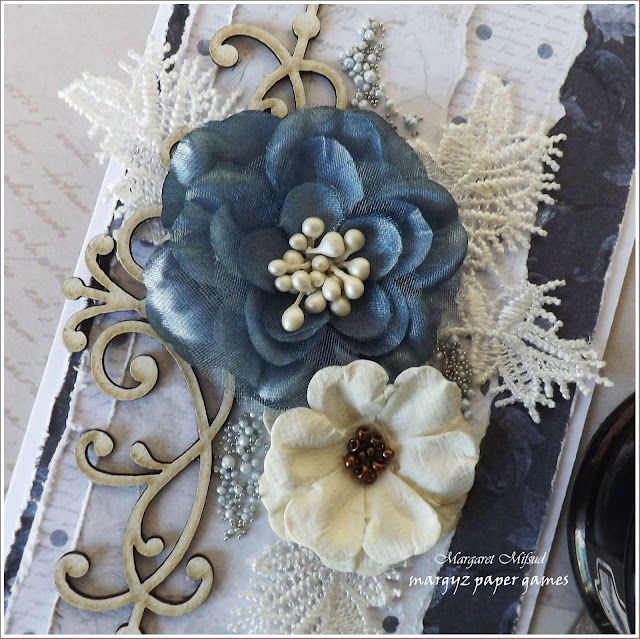 The papers and the stamps are by Kaisercraft. I simply stamped with Distress Embossing Ink and then heat embossed with Rangers' Seafoam White Embossing Powder.